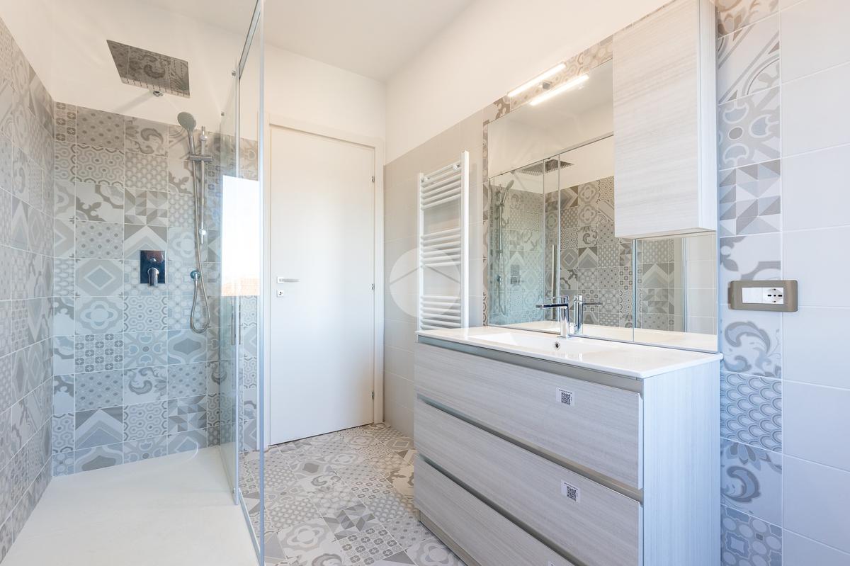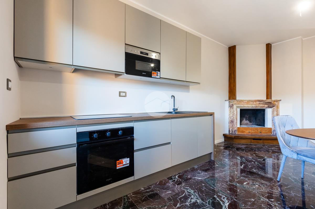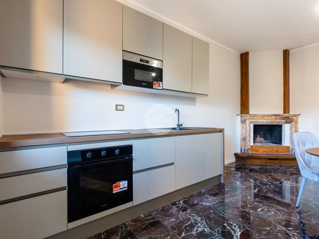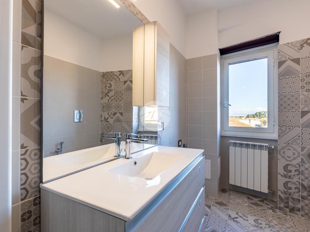 L'immobile si apre su un luminoso e accogliente soggiorno con angolo cottura completo di arredamento e un camino con rivestimenti in marmo e legno, con accesso al primo balcone. Inoltre troviamo un pratico soppalco, con accesso dalla camera da letto. La zona notte è composta da una confortevole camera matrimoniale, con affaccio panoramico su San Pietro, parzialmente arredata con letto contenitore e materasso memory, e una seconda camera singola con parquet e balcone privato. Ampio bagno completo di box doccia, mobile lavabo e sanitari filo muro. Le piastrelle presentano un design patchwork moderno con toni neutri e dettagli contemporanei, che donano all'ambiente un aspetto elegante e dinamico.