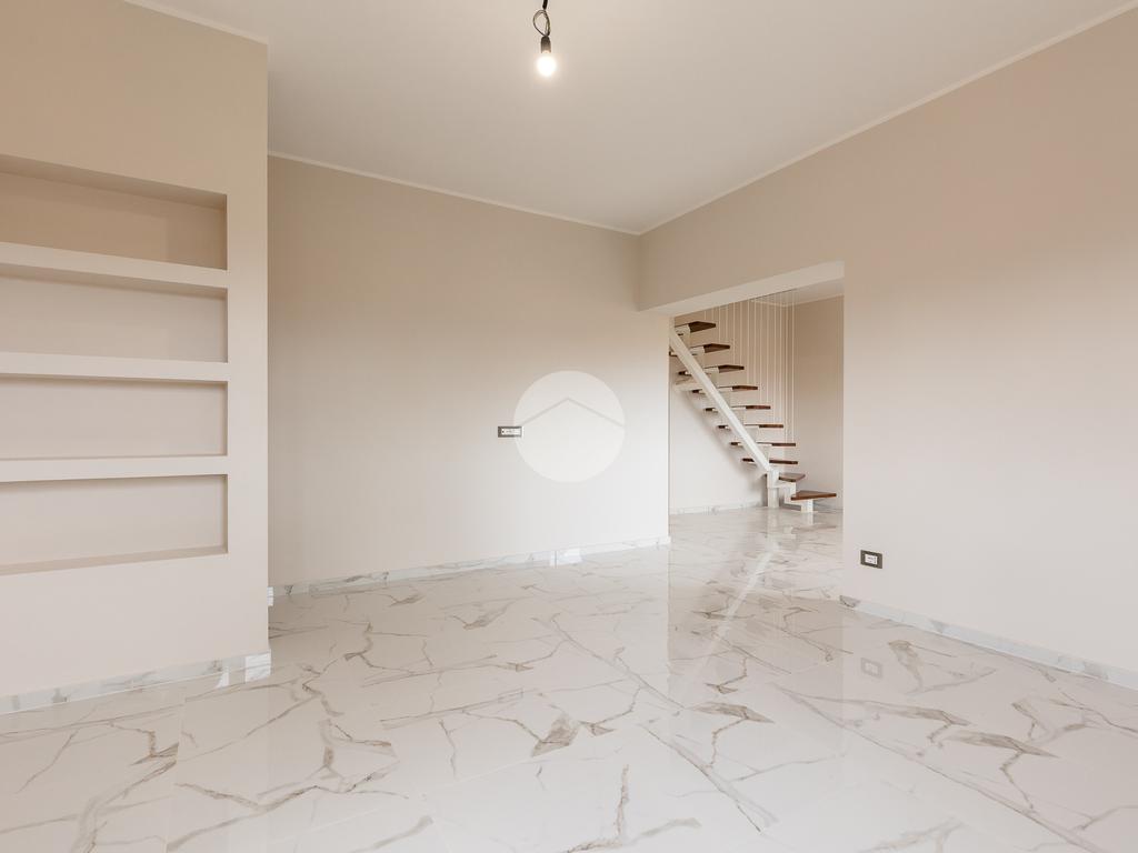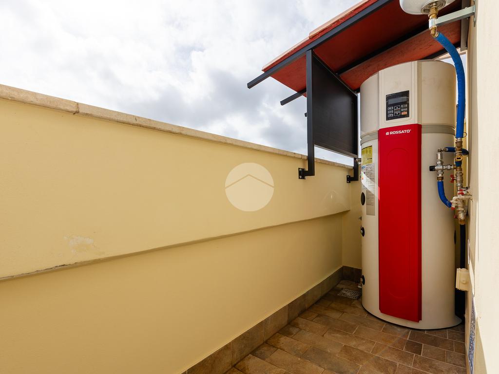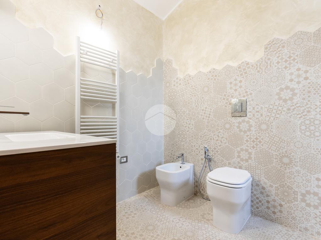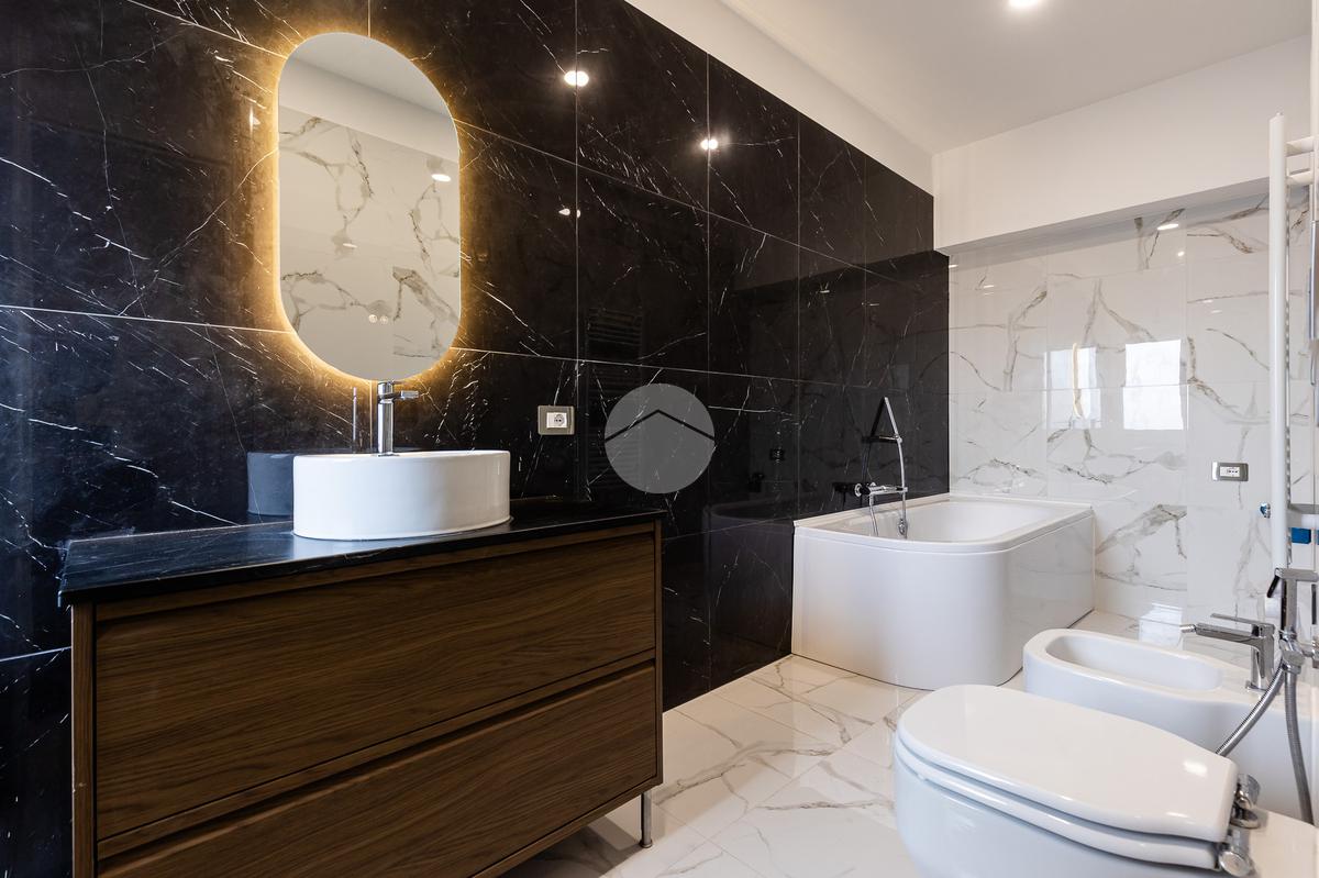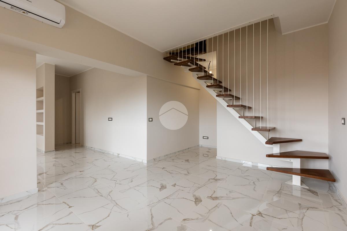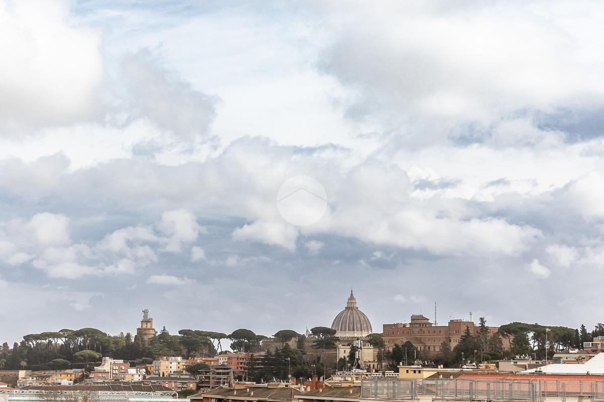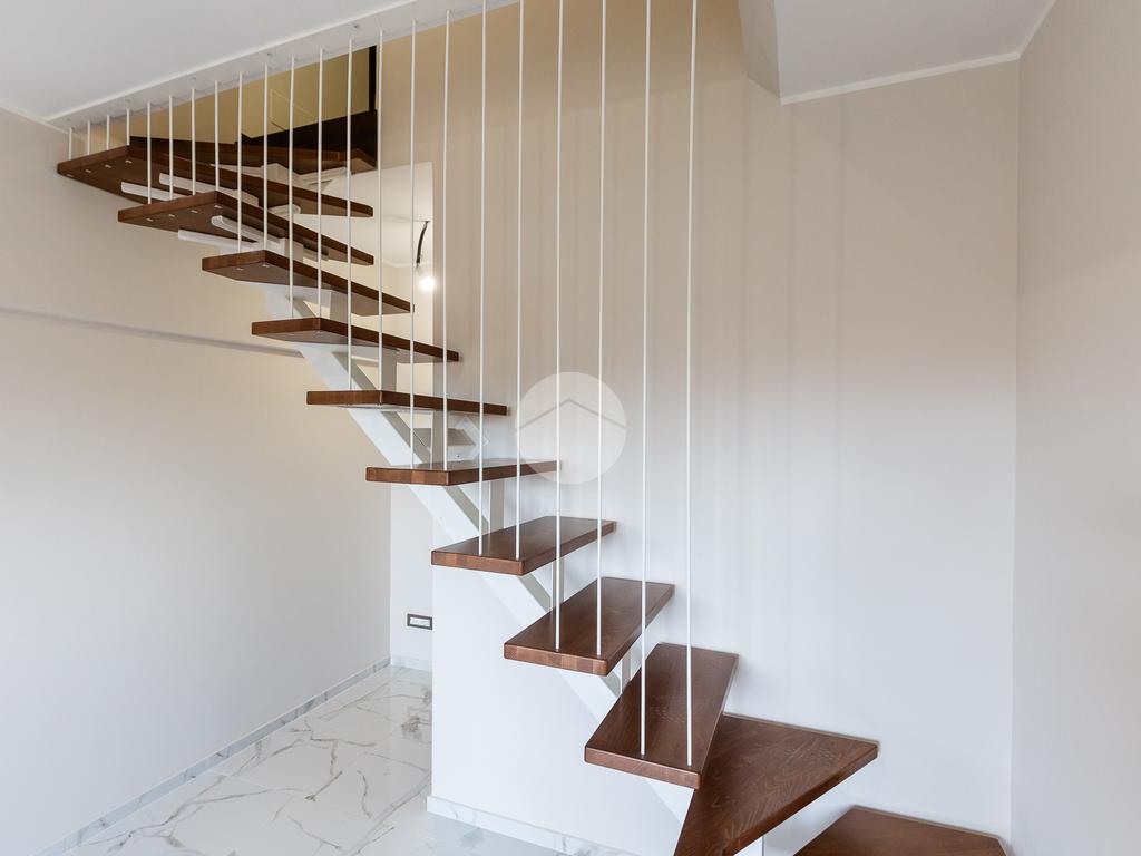 L'appartamento si sviluppa su due livelli con una funzionale separazione della zona notte e zona giorno. All'ingresso ci accoglie un salone doppio rivestito in gres effetto marmo, con una prima porzione climatizzata destinata all'angolo cottura e con accesso ad un balcone completamente ripavimentato; seconda parte anch'essa climatizzata, con affacio aperto, scorcio su San Pietro e accesso ad un ampio bagno: rivestimento in gres effetto marmo scuro, vasca, mobile lavabo e specchio digitale retroilluminato a led. Tramite una scala in ferro bianco e legno massello accediamo alla zona notte completamente rivestita in parquet iroko composta di due camere anch'esse climatizzate e accesso ad un altro balcone.