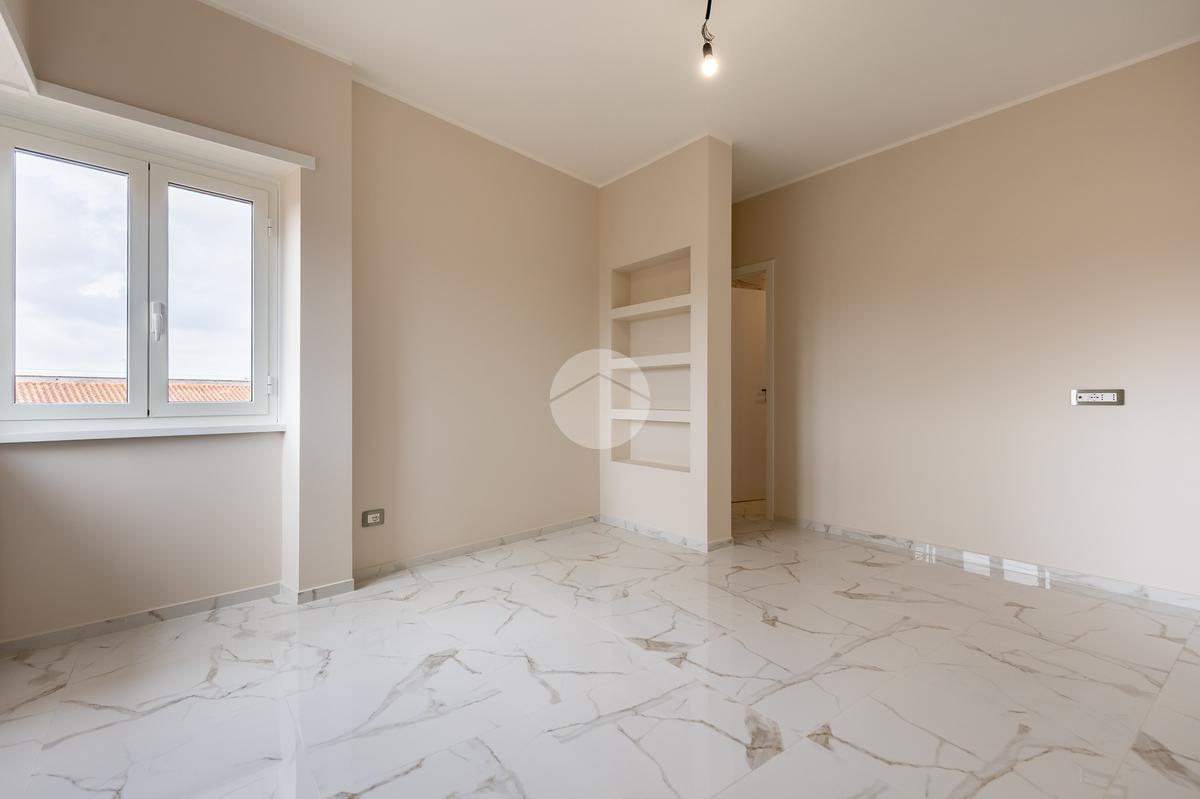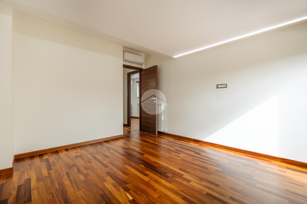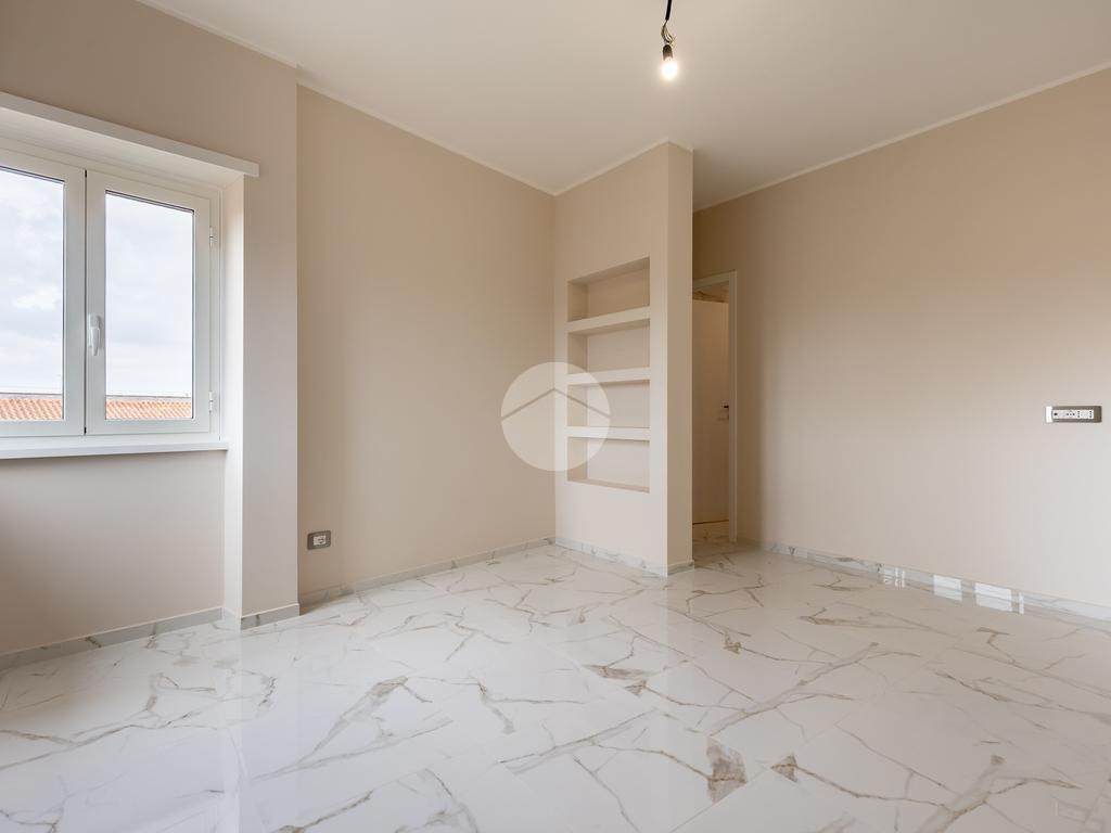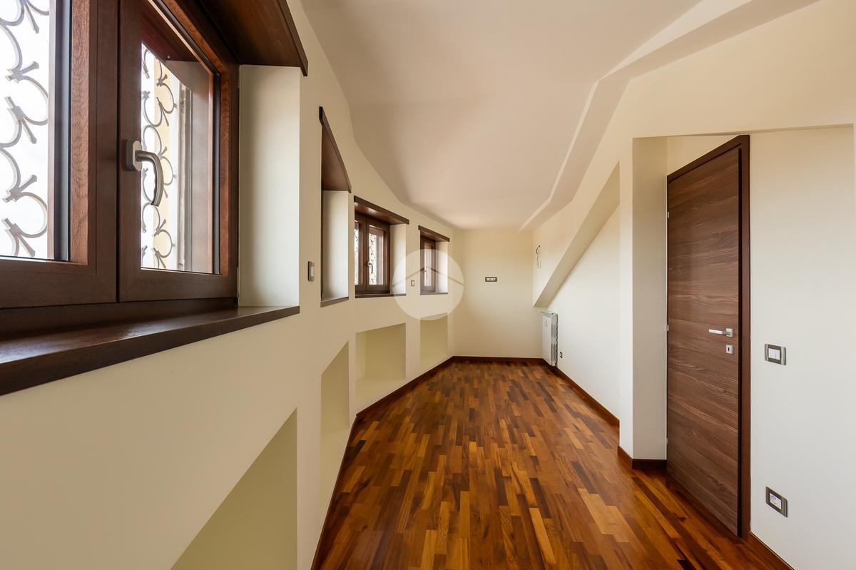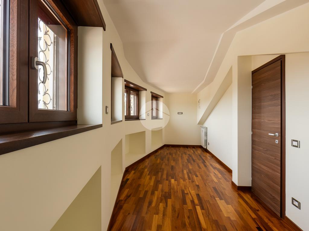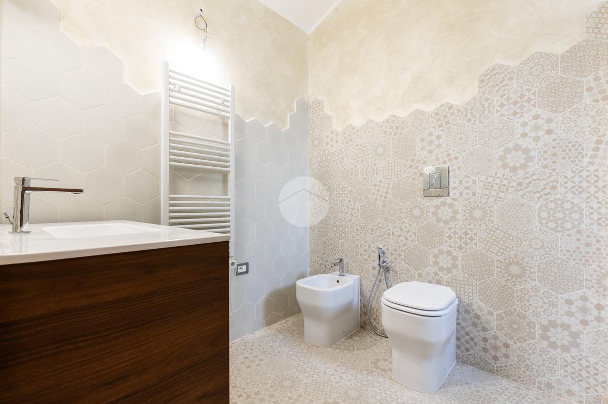 L'appartamento si sviluppa su due livelli con una funzionale separazione della zona notte e zona giorno. All'ingresso ci accoglie un salone doppio rivestito in gres effetto marmo, con una prima porzione climatizzata destinata all'angolo cottura e con accesso ad un balcone completamente ripavimentato; seconda parte anch'essa climatizzata, con affacio aperto, scorcio su San Pietro e accesso ad un ampio bagno: rivestimento in gres effetto marmo scuro, vasca, mobile lavabo e specchio digitale retroilluminato a led. Tramite una scala in ferro bianco e legno massello accediamo alla zona notte completamente rivestita in parquet iroko composta di due camere anch'esse climatizzate e accesso ad un altro balcone.